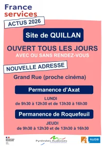 Depuis le 2 février 2026, la France Services de Quillan vous accueille dans un nouvel espace, moderne et adapté, situé à côté du cinéma (Avenue Vaysse Barthélémy, Grand rue).