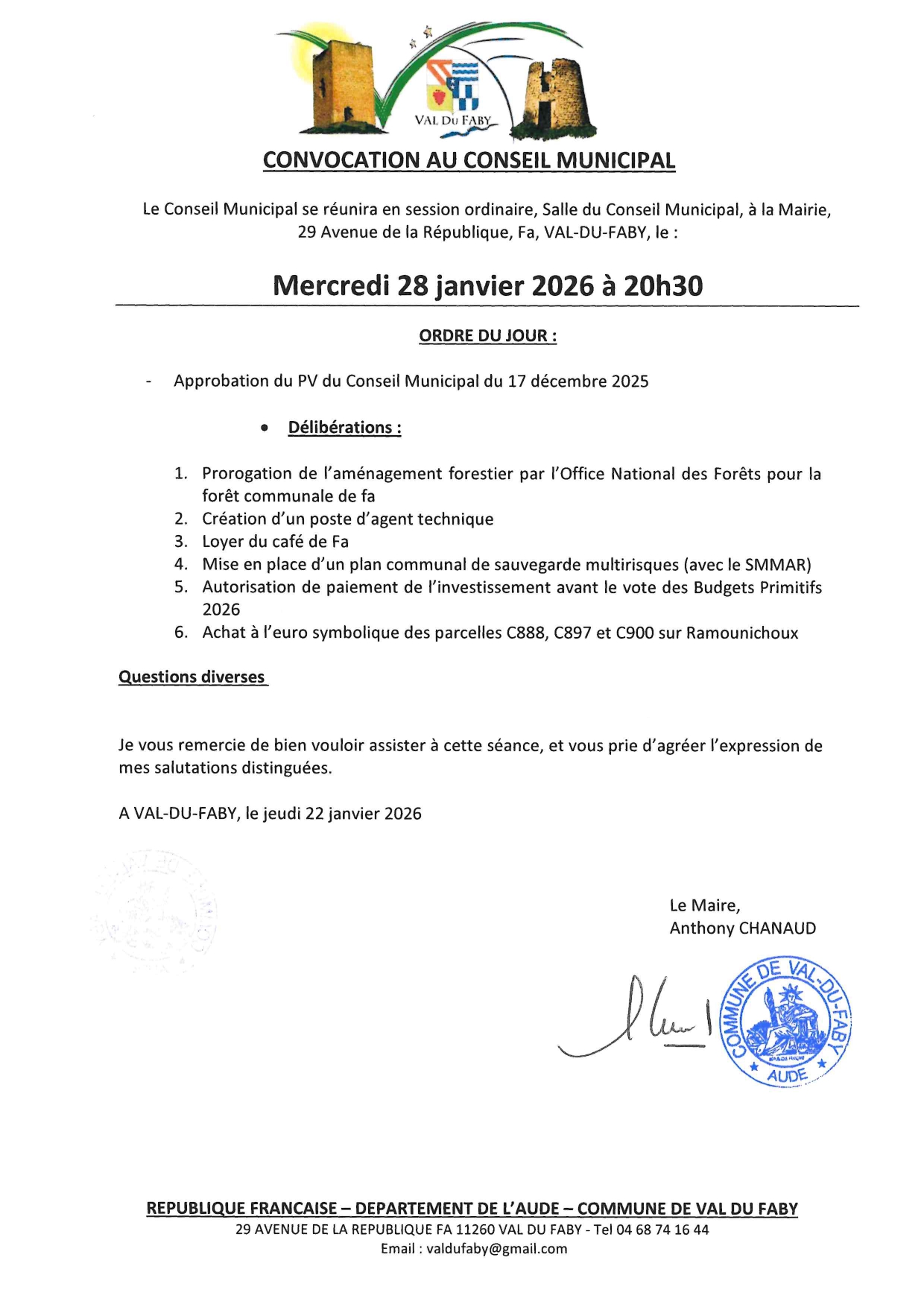 Veuillez trouver ci-dessous l’invitation au prochain conseil municipal.